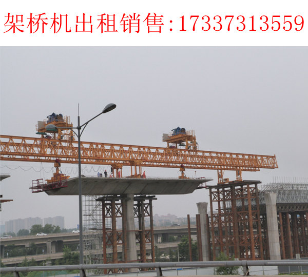 雙梁式架橋機吊臂是由左右兩條箱梁組成,兩梁貫通機身并向前后端伸出。在兩端都有各由兩腿桿組成的折疊立柱。橫跨兩條箱梁有兩臺桁車,能沿吊臂縱向行駛。吊梁小車置于桁車上,能沿桁車橫向行駛。待架的梁片(或整梁)可用鐵路平板車直接送到架橋機的后臂之下,用吊梁小車起吊后,憑桁車前移,再以吊梁小車橫移,然后落梁就位。架梁之后要立即鋪軌,架橋機才能繼續向前作業。后兩種架橋機一般都能將預先組裝好的軌排吊裝就位,使架梁工作不會因鋪軌而造成延誤。這類架橋機的前后端都可吊梁及落梁;改變架梁方向時,不需要調頭;為適應曲線架梁,前后臂都可在水平面內擺動;分片架設時不必移梁或撥道,梁即可就位;“喂梁”也不需要橋頭岔線或特制運梁車。